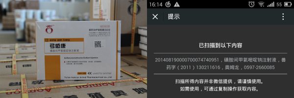 日前,我司接农业部通知赴京参加“国家兽药产品追溯信息系统扩大试点工作”会议,成为全国首批试行兽药二维码监管的108家兽药生产企业之一。会议结束以后,我司迅速投入准备工作中,组建专项小组,先后投入十几万元购置专业设备,改进生产线;经过几个月的实践,顺利配合农业部完成了兽药二维码追溯系统试点工作。目前我司已有多个批次的产品:奥噻林(阿莫西林可溶性粉)、虫痢康(芬苯达唑粉)、弓感康(磺胺间甲氧嘧啶钠注射液)与农业部兽药追溯系统完成匹配。