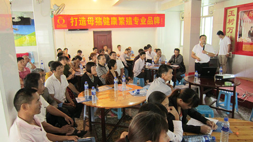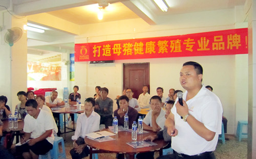 2012年9月15日,福建奥姆龙动物药业有限公司营销总监杨思齐和技术总监郭金权在龙岩适中悦华酒家二楼开展《夏秋季节变化猪场常发疾病的有效防控对策》,为养殖户提供专业的技术服务指导。