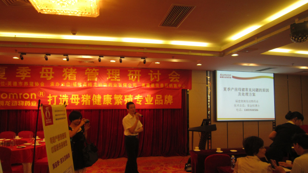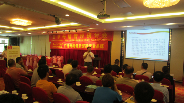 2013年6月14日,公司在广东英德召开“夏季母猪管理研讨会”暨公司技术推广会,会议在董事长林振雁的主持下拉开了序幕。紧接着公司技术部总监郭金权老师针对“夏季产房母猪常见问题的原因及处理方案”进行了详细的解说,会议现场座无虚席,互动氛围热烈。