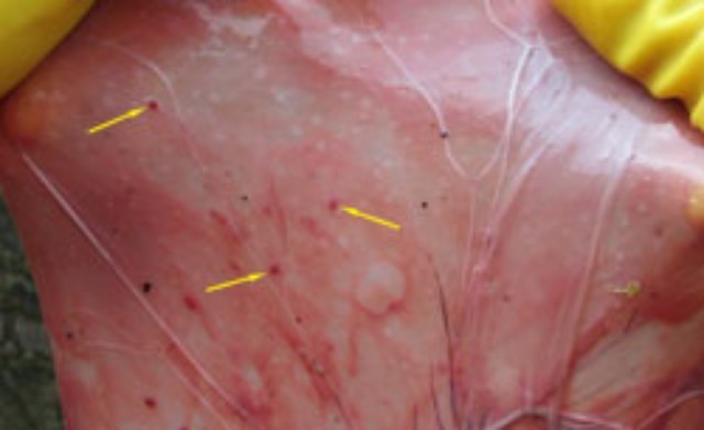 2.母猪返情率偏高,胎盘上会出现白斑或绿豆大小出血斑。