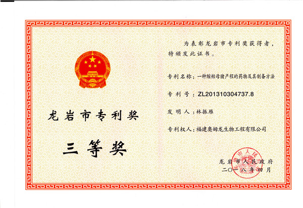 热烈祝贺福建奥姆龙生物工程有限公司荣获龙岩市专利奖三等奖。