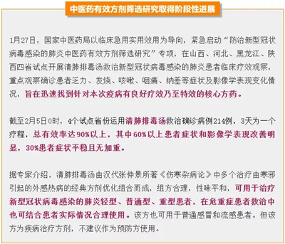 在武汉市中医院、湖北省中西医结合医院等单位开展的研究对照显示:与对照组相比,临床治愈率能够提高22%。河南一医院使用该方治疗轻型、普通型患者40例,平均治愈时间为9.66天,无一转重。湖北武汉使用该方治疗患者,轻型和普通型明显治愈,无一转重。