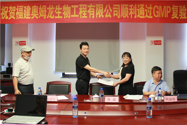 经过专家组认真考评,得出综合评定:推荐福建奥姆龙生物工程有限公司最终灭菌小容量注射剂/最终灭菌大容量非静脉注射剂、粉剂/散剂/预混剂、非氯消毒剂(液体) 为兽药GMP合格生产线。