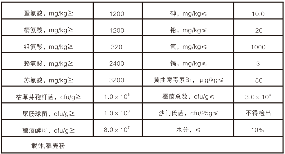 【原料组成】蛋氨酸、精氨酸、组氨酸、赖氨酸、苏氨酸、枯草芽孢杆菌、屎肠球菌、酿酒酵母、