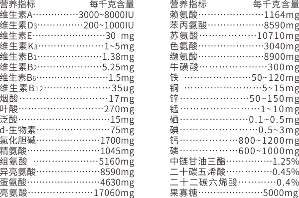 【原料组成 】11种犬必需氨基酸、牛磺酸、中链甘油三酯、Ω-3(亚麻酸+ EPA+ DHA)、复合维生素、复合微量元素、果寡糖、羊奶粉(载体)等。