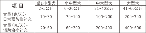 本品可调成糊状单独饲喂或和主粮上拌喂,推荐剂量为体重的0.5%(日常预防性补充)~1.0%(辅助治疗补充)(或按照食量推荐表)。