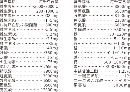 【原料组成 】12种必需氨基酸、甘露糖、L-抗坏血酸-2-磷酸酯、中链脂肪酸(MCT)、Ω-3(亚麻酸+ EPA+ DHA)、复合维生素、复合微量元素、果寡糖、鸡肉粉和奶粉(载体)等。
