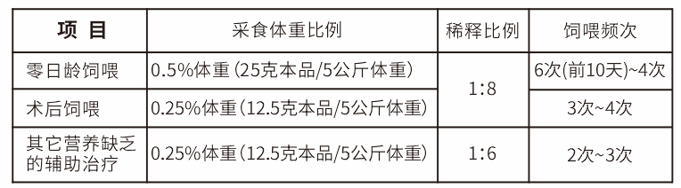 2、干法饲喂:按照上表采食体重百分比和饲喂频次,称量适量奶粉,直接饲喂或拌在主粮一起饲喂。